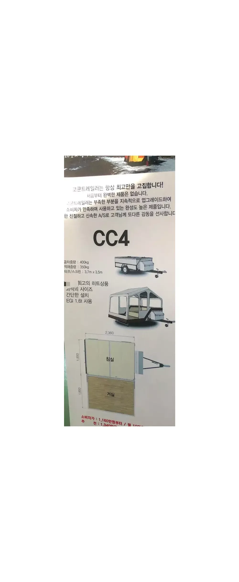 코쿤 CC4 2021년 09월식 처분합니다. 캠핑카+트레일러 조합으로 다닐려고 구매했는데 식구가 적어 캠핑카에서 주로 자게 되더라구요 이너텐트도 넣었기 때문에 잘때는 내려서 침상, 거실 나눠서 아이 포함 최대 6인은 편하게 주무실 수 있습니다. 모델명 : CC420 모델연도 : 2021. 09월. 09일 지금은 아파트 주차장에 보관중입니다. 번호판이 있다보니 주차등록 해두고 주차가 가능합니다. 길이 4110mm, 너비 1870mm, 높이 1250mm 의 사이즈로 작은 공간에 주차가 가능해서 좋습니다. 실내 침상(2.4m x 1.85m) 거실(2.4m x 18.5m) 나뉘어져 있습니다. 구성은 매트 2장, 실내 이너텐트, 실외 타프, 실외 스크린, 주차보호커버, 외부 선반, 실내등, 기름통 1개 (기억나는데로 추가 하겠습니다) A/S 는 전국 3군데에서 가능합니다.